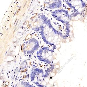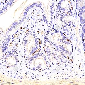 IHC检测PLVAP/PV-1蛋白(货号 GB113141). 样品: 大鼠结肠, 4%多聚甲醛 (货号G1101) 固定12-24小时. 抗原修复: 柠檬酸抗原修复液(干粉, pH 6.0) (G1201), 98℃, 20分钟. —抗: 1: 2100稀释, 4℃ 孵育过夜. 二抗: HRP标记山羊抗兔IgG (H+L) (货号GB23303), 1: 200稀释, 室温孵育1小时. |