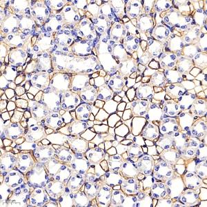 IHC检测PLVAP/PV-1蛋白(货号 GB113141). 样品: 大鼠肾, 4%多聚甲醛 (货号G1101) 固定12-24小时. 抗原修复: 柠檬酸抗原修复液(干粉, pH 6.0) (G1201), 98℃, 20分钟. —抗: 1: 2100稀释, 4℃ 孵育过夜. 二抗: HRP标记山羊抗兔IgG (H+L) (货号GB23303), 1: 200稀释, 室温孵育1小时. |