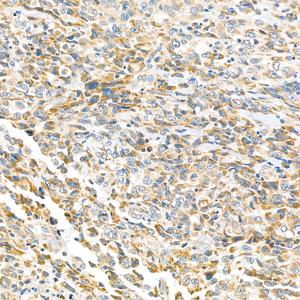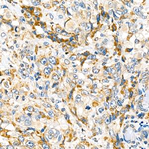 IHC检测Rab5蛋白(货号 GB111104). 样品: 人肺癌, 4%多聚甲醛 (货号G1101) 固定12-24小时. 抗原修复: 柠檬酸抗原修复液(干粉, pH 6.0) (G1201), 98℃, 20分钟. —抗: 1: 1000稀释, 4℃ 孵育过夜. 二抗: HRP标记山羊抗兔IgG (H+L) (货号GB23303), 1: 200稀释, 室温孵育1小时. |