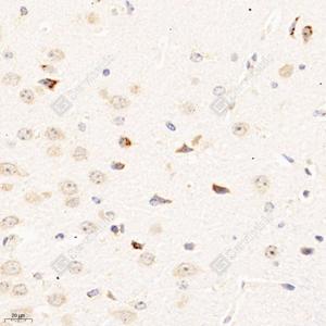 IHC检测GOLPH2蛋白(货号 GB113465). 样品: 小鼠脑, 4%多聚甲醛 (货号G1101) 固定12-24小时. 抗原修复: 柠檬酸抗原修复液(干粉, pH 6.0) (G1201), 98℃, 20分钟. —抗: 1: 3000稀释, 4℃ 孵育过夜. 二抗: HRP标记山羊抗兔IgG (H+L) (货号GB23303), 1: 200稀释, 室温孵育1小时. |