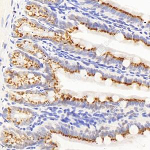 IHC检测GOLPH2蛋白(货号 GB113465). 样品: 小鼠回肠, 4%多聚甲醛 (货号G1101) 固定12-24小时. 抗原修复: 柠檬酸抗原修复液(干粉, pH 6.0) (G1201), 98℃, 20分钟. —抗: 1: 3000稀释, 4℃ 孵育过夜. 二抗: HRP标记山羊抗兔IgG (H+L) (货号GB23303), 1: 200稀释, 室温孵育1小时. |