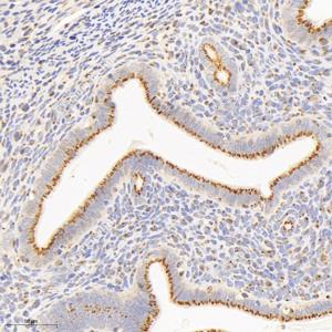 IHC检测GOLPH2蛋白(货号 GB113465). 样品: 小鼠子宫, 4%多聚甲醛 (货号G1101) 固定12-24小时. 抗原修复: 柠檬酸抗原修复液(干粉, pH 6.0) (G1201), 98℃, 20分钟. —抗: 1: 3000稀释, 4℃ 孵育过夜. 二抗: HRP标记山羊抗兔IgG (H+L) (货号GB23303), 1: 200稀释, 室温孵育1小时. |