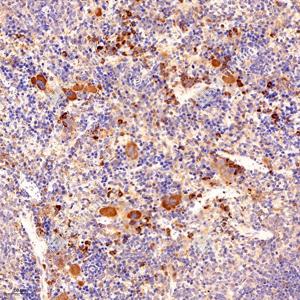 IHC检测LITAF蛋白(货号 GB112990). 样品: 大鼠脾, 4%多聚甲醛 (货号G1101) 固定12-24小时. 抗原修复: 柠檬酸抗原修复液(干粉, pH 6.0) (G1201), 98℃, 20分钟. —抗: 1: 2400稀释, 4℃ 孵育过夜. 二抗: HRP标记山羊抗兔IgG (H+L) (货号GB23303), 1: 200稀释, 室温孵育1小时. |