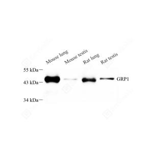 WB检测Cytohesin 3蛋白(货号 GB112389). 样品: 经RIPA裂解液(货号G2002)处理的蛋白质. 封闭: 封闭: 3%脱脂牛奶(货号GC310001)溶于TBST溶液, 室温孵育1小时. —抗: 1: 250稀释, 4℃ 孵育过夜. 二抗: HRP标记山羊抗兔IgG (H+L) (货号GB23303), 1: 5000稀释, 室温孵育1小时. |