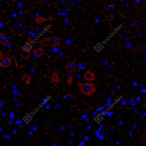 IF检测RTN3/HAP蛋白(货号 GB114482)(红色). 样品: 小鼠小脑, 4%多聚甲醛 (货号G1101) 固定12-24小时. 抗原修复: Tris-EDTA抗原修复液(pH 9.0) (G1203), 98℃, 20分钟. 封闭: 3% BSA(货号GC305010)的PBS溶液, 室温孵育30分钟. —抗: 1: 1000稀释, 4℃ 孵育过夜. 二抗: Cy3标记山羊抗兔IgG (H+L) (货号GB21303), 1: 300稀释, 室温孵育1小时. |