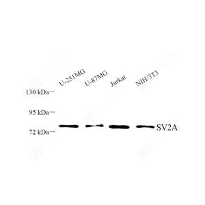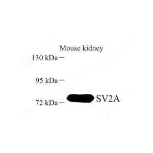 SV2s (Synaptic Vesicle protein 2) are integral membrane glycoproteins present in all synaptic vesicles. There are three characterized isoforms, SV2A, SV2B and SV2C. SV2A is expressed ubiquitously throughout the brain. SV2B has a more restricted distribution with varying degrees of coexpression with SV2A. SV2C is more closely related to SV2A but shows a very restricted expression pattern. SV2A is probably involved in the maintenance of a pool of synaptic vesicles competent for calcium-stimulated exocytosis. SV2A is a highly glycosylated synaptic vesicle protein with homology to transmembrane transporters.