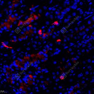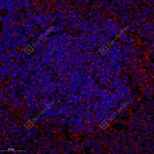 | IF检测SYTL2/SLP2蛋白(货号 GB112767)(红色). 样品: 大鼠脾, 4%多聚甲醛 (货号G1101) 固定12-24小时. 抗原修复: Tris-EDTA抗原修复液(pH 9.0) (G1203), 98℃, 20分钟. 封闭: 3% BSA(货号GC305010)的PBS溶液, 室温孵育30分钟. —抗: 1: 600稀释, 4℃ 孵育过夜. 二抗: Cy3标记山羊抗兔IgG (H+L) (货号GB21303), 1: 300稀释, 室温孵育1小时. |