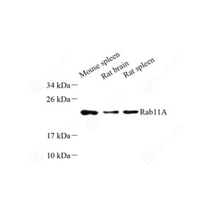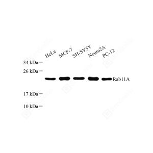RAB11 has two isoform genes RAB11A(YL8) and RAB11B(YPT3), and belongs to the small GTPase super family and Rab family. It regulates endocytic recycling. RAB11 may exert its functions by interacting with multiple effector proteins in different complexes. It acts as a major regulator of membrane delivery during cytokinesis. RAB11 regulates the recycling of FCGRT (receptor of Fc region of monomeric Ig G) to basolateral membranes. This antibody can recognize both RAB11A(24 kDa) and RAB11B(24 kDa).