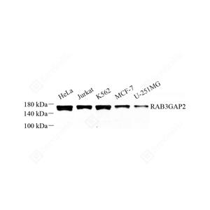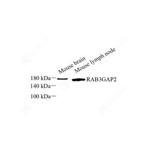 RAB3GAP2, also known as RAB3-GAP150, belongs to the Rab3-GAP regulatory subunit family. Rab3 GAP consists of two subunits: the catalytic subunit p130 and the noncatalytic subunit p150. Rab3 GAP is ubiquitously expressed and enriched in the synaptic soluble fraction of brain, consistent with it having a key role in neurodevelopment. RAB3-GAP150 forms the Rab3 GTPase-activating complex with RAB3-GAP130,where it constitutes the regulatory subunit, whereas the latter functions as the catalytic subunit. Defects in RAB3-GAP150 are the cause of Martsolf and Warburg Micro syndrome.