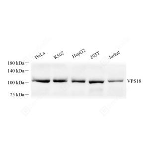 WB检测VPS18蛋白(货号 GB111550). 样品: 经RIPA裂解液(货号G2002)处理的蛋白质. 封闭: 封闭: 3%脱脂牛奶(货号GC310001)溶于TBST溶液, 室温孵育1小时. —抗: 1: 500稀释, 4℃ 孵育过夜. 二抗: HRP标记山羊抗兔IgG (H+L) (货号GB23303), 1: 5000稀释, 室温孵育1小时. |
