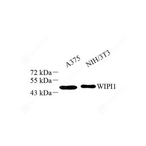 WB检测WIPI1蛋白(货号 GB111616). 样品: 经RIPA裂解液(货号G2002)处理的蛋白质. 封闭: 封闭: 3%脱脂牛奶(货号GC310001)溶于TBST溶液, 室温孵育1小时. —抗: 1: 500稀释, 4℃ 孵育过夜. 二抗: HRP标记山羊抗兔IgG (H+L) (货号GB23303), 1: 5000稀释, 室温孵育1小时. |