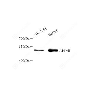 WB检测AP1M1蛋白(货号 GB114775). 样品: 经RIPA裂解液(货号G2002)处理的蛋白质. 封闭: 封闭: 3%脱脂牛奶(货号GC310001)溶于TBST溶液, 室温孵育1小时. —抗: 1: 300稀释, 4℃ 孵育过夜. 二抗: HRP标记山羊抗兔IgG (H+L) (货号GB23303), 1: 5000稀释, 室温孵育1小时. |