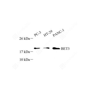 TRAPPC3 (trafficking protein particle complex 3, also known as Bet3) is a component of TRAPP, a complex involved in the tethering of transport vesicles to the cis-Golgi membrane. There are three TRAPP complexes identified in yeast with distinct roles: TRAPPI in ER-Golgi traffic, TRAPPII in intra-Golgi and endosome-Golgi traffic, and TRAPPIII in autophagy. Recently it has been proposed that at least two complexes exist in mammals. It has also been reported that TRAPPC3 is required for Rabin8 centrosome trafficking and ciliogenesis. Expressed ubiquitously, TRAPPC3 protein is present in both membrane-bound and cytosolic forms.