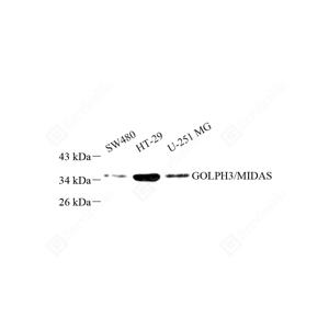 GOLPH3 (also called GPP34, GMx33, MIDAS, or yeast Vps74p) is a 34-kDa Golgi-associated protein conserved from yeast to human. GOLPH3 binds to PtdIns(4)P-rich trans-Golgi membranes and MYO18A conveying a tensile force required for efficient tubule and vesicle formation . GOLPH3 has been recently demonstrated as a novel oncoprotein amplified in various types of human malignancies, including melanoma, breast, non-small cell lung cancer, gliomas and connective tissue tumors . Enhanced activation of mTOR signalling represents a molecular basis for the oncogenic activity of GOLPH3.