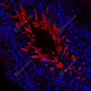 IF检测HOOK1蛋白(货号 GB114077)(红色). 样品: 小鼠睾丸, 4%多聚甲醛 (货号G1101) 固定12-24小时. 抗原修复: Tris-EDTA抗原修复液(pH 9.0) (G1203), 98℃, 20分钟. 封闭: 3% BSA(货号GC305010)的PBS溶液, 室温孵育30分钟. —抗: 1: 1000稀释, 4℃ 孵育过夜. 二抗: Cy3标记山羊抗兔IgG (H+L) (货号GB21303), 1: 300稀释, 室温孵育1小时. |