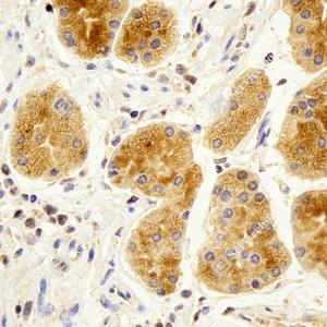 IHC检测LZTR2蛋白(货号 GB115344). 样品: 人胃, 4%多聚甲醛 (货号G1101) 固定12-24小时. 抗原修复: Tris-EDTA抗原修复液(pH 9.0) (G1203), 98℃, 20分钟. —抗: 1: 1000稀释, 4℃ 孵育过夜. 二抗: HRP标记山羊抗兔IgG (H+L) (货号GB23303), 1: 200稀释, 室温孵育1小时. |