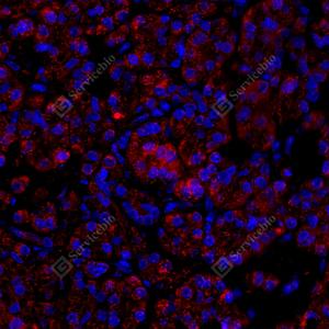 IF检测SFT2D3蛋白(货号 GB114408)(红色). 样品: 人胰腺, 4%多聚甲醛 (货号G1101) 固定12-24小时. 抗原修复: Tris-EDTA抗原修复液(pH 9.0) (G1203), 98℃, 20分钟. 封闭: 3% BSA(货号GC305010)的PBS溶液, 室温孵育30分钟. —抗: 1: 1000稀释, 4℃ 孵育过夜. 二抗: Cy3标记山羊抗兔IgG (H+L) (货号GB21303), 1: 300稀释, 室温孵育1小时. |