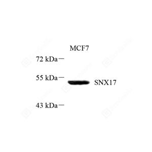 Sorting nexin 17 (SNX17, synonym: KIAA0064) is a member of the sorting nexin family. Members of this family contain a phox (PX) domain, which is a phosphoinositide binding domain, and are involved in intracellular trafficking. SNX17 does not contain a coiled coil region, like some family members, but contains a B41 domain. This protein interacts with the cytoplasmic domain of P-selectin, and may function in the intracellular trafficking of P-selectin.
