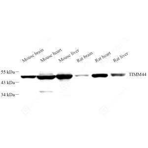 WB检测TIM44蛋白(货号 GB113155). 样品: 经RIPA裂解液(货号G2002)处理的蛋白质. 封闭: 封闭: 3%脱脂牛奶(货号GC310001)溶于TBST溶液, 室温孵育1小时. —抗: 1: 2000稀释, 4℃ 孵育过夜. 二抗: HRP标记山羊抗兔IgG (H+L) (货号GB23303), 1: 5000稀释, 室温孵育1小时. |
