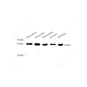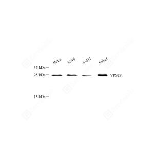 WB检测VPS28蛋白(货号 GB114446). 样品: 经RIPA裂解液(货号G2002)处理的蛋白质. 封闭: 3%脱脂牛奶(货号GC310001)溶于TBST溶液, 室温孵育1小时. —抗: 1: 1000稀释, 4℃ 孵育过夜. 二抗: HRP标记山羊抗兔IgG (H+L) (货号GB23303), 1: 5000稀释, 室温孵育1小时. |