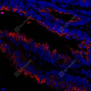 IF检测VPS28蛋白(货号 GB114446)(红色). 样品: 人结肠癌, 4%多聚甲醛 (货号G1101) 固定12-24小时. 抗原修复: Tris-EDTA抗原修复液(pH 9.0) (G1203), 98℃, 20分钟. 封闭: 3% BSA(货号GC305010)的PBS溶液, 室温孵育30分钟. —抗: 1: 1000稀释, 4℃ 孵育过夜. 二抗: Cy3标记山羊抗兔IgG (H+L) (货号GB21303), 1: 300稀释, 室温孵育1小时. |