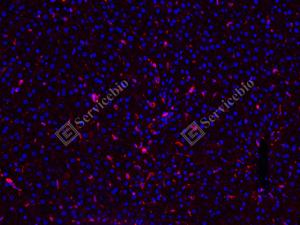 | IF检测beta Actin蛋白(货号 GB11001)(红色). 样品: 大鼠肝, 4%多聚甲醛 (货号G1101) 固定12-24小时. 抗原修复: Tris-EDTA抗原修复液 (pH 9.0) (G1203), 98℃, 20分钟. 封闭: 3% BSA(货号GC305010)的PBS溶液, 室温孵育30分钟. —抗: 1: 1000, 4℃ 孵育过夜. 二抗: Cy3标记山羊抗兔IgG (H+L) (货号GB21303), 1: 300稀释, 室温孵育1小时. |