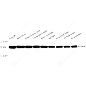 WB检测alpha Tubulin蛋白(货号 GB12200). 样品: 经RIPA裂解液(货号G2002)处理的蛋白质. 封闭: 3%脱脂牛奶(货号GC310001)溶于TBST溶液, 室温孵育1小时. —抗: 1: 2000稀释, 4℃ 孵育过夜. 二抗: HRP标记山羊抗小鼠IgG (H+L) (货号GB23301), 1: 5000稀释, 室温孵育1小时. |