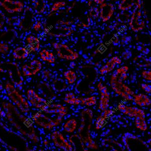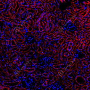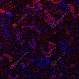 IF检测alpha Tubulin蛋白(货号 GB12200)(红色). 样品: 小鼠肾, 4%多聚甲醛 (货号G1101) 固定12-24小时. 抗原修复: 柠檬酸抗原修复液(干粉, pH 6.0) (G1201), 高压锅均匀喷气计时2分钟. 封闭: 3% BSA(货号GC305010)的PBS溶液, 室温孵育30分钟. —抗: 1: 2000稀释, 4℃ 孵育过夜. 二抗: Cy3标记山羊抗小鼠IgG (H+L) (货号GB21301), 1: 300稀释, 室温孵育1小时. |