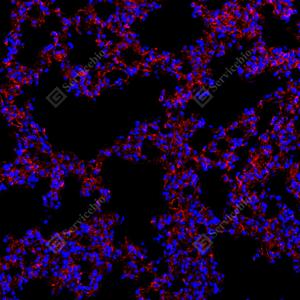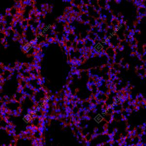 IF检测alpha Tubulin蛋白(货号 GB12200)(红色). 样品: 小鼠肺, 4%多聚甲醛 (货号G1101) 固定12-24小时. 抗原修复: 柠檬酸抗原修复液(干粉, pH 6.0) (G1201), 高压锅均匀喷气计时2分钟. 封闭: 3% BSA(货号GC305010)的PBS溶液, 室温孵育30分钟. —抗: 1: 2000稀释, 4℃ 孵育过夜. 二抗: Cy3标记山羊抗小鼠IgG (H+L) (货号GB21301), 1: 300稀释, 室温孵育1小时. |