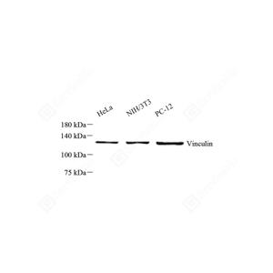 WB检测Vinculin蛋白(货号 GB111328). 样品: 经RIPA裂解液(货号G2002)处理的蛋白质. 封闭: 封闭: 3%脱脂牛奶(货号GC310001)溶于TBST溶液, 室温孵育1小时. —抗: 1: 500稀释, 4℃ 孵育过夜. 二抗: HRP标记山羊抗兔IgG (H+L) (货号GB23303), 1: 5000稀释, 室温孵育1小时. |