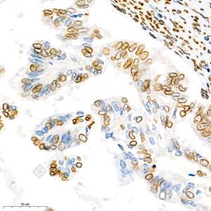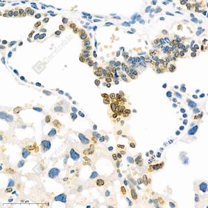 IHC检测Lamin B1蛋白(货号 GB111802). 样品: 小鼠胎盘, 4%多聚甲醛 (货号G1101) 固定12-24小时. 抗原修复: 柠檬酸抗原修复液(干粉, pH 6.0) (G1201), 98℃, 20分钟. —抗: 1: 300稀释, 4℃ 孵育过夜. 二抗: HRP标记山羊抗兔IgG (H+L) (货号GB23303), 1: 200稀释, 室温孵育1小时. |