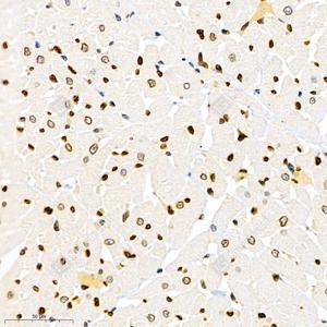 IHC检测Lamin B1蛋白(货号 GB111802). 样品: 大鼠心, 4%多聚甲醛 (货号G1101) 固定12-24小时. 抗原修复: 柠檬酸抗原修复液(干粉, pH 6.0) (G1201), 98℃, 20分钟. —抗: 1: 300稀释, 4℃ 孵育过夜. 二抗: HRP标记山羊抗兔IgG (H+L) (货号GB23303), 1: 200稀释, 室温孵育1小时. |