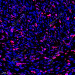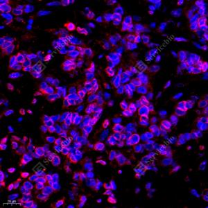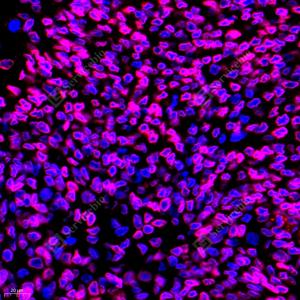 IF检测Lamin B1蛋白(货号 GB111802)(红色). 样品: 人子宫癌, 4%多聚甲醛 (货号G1101) 固定12-24小时. 抗原修复: Tris-EDTA抗原修复液(pH 9.0) (G1203), 98℃, 20分钟. 封闭: 3% BSA(货号GC305010)的PBS溶液, 室温孵育30分钟. —抗: 1: 300稀释, 4℃ 孵育过夜. 二抗: Cy3标记山羊抗兔IgG (H+L) (货号GB21303), 1: 300稀释, 室温孵育1小时. |