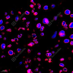 IF检测Lamin B1蛋白(货号 GB111802)(红色). 样品: 人乳腺癌, 4%多聚甲醛 (货号G1101) 固定12-24小时. 抗原修复: Tris-EDTA抗原修复液(pH 9.0) (G1203), 98℃, 20分钟. 封闭: 3% BSA(货号GC305010)的PBS溶液, 室温孵育30分钟. —抗: 1: 300稀释, 4℃ 孵育过夜. 二抗: Cy3标记山羊抗兔IgG (H+L) (货号GB21303), 1: 300稀释, 室温孵育1小时. |