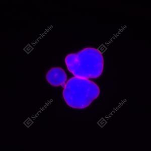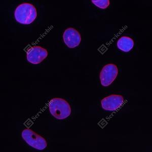 ICC检测Lamin B1蛋白(货号 GB111802)(红色). 样品: HeLa细胞, 4%多聚甲醛 (货号G1101) 固定12-24小时. 封闭: 3% BSA(货号GC305010)的PBS溶液, 室温孵育30分钟. 一抗: 1: 200稀释, 4℃ 孵育过夜. 二抗: Cy3标记山羊抗兔IgG (H+L) (货号GB21303), 1: 300稀释, 室温孵育1小时. |