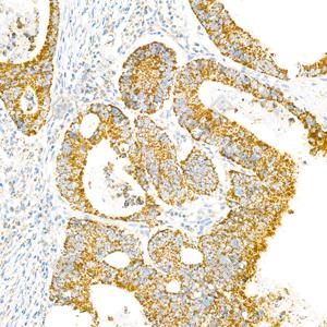 IHC检测Hsp60蛋白(货号 GB12243). 样品: 人结肠癌, 4%多聚甲醛 (货号G1101) 固定12-24小时. 抗原修复: 柠檬酸抗原修复液(干粉, pH 6.0) (G1201), 高压锅均匀喷气计时2分钟. —抗: 1: 2000稀释, 4℃ 孵育过夜. 二抗: HRP标记山羊抗小鼠IgG (H+L) (货号GB23301), 1: 200稀释, 室温孵育1小时. |