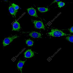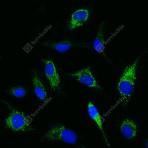 ICC检测Hsp60蛋白(货号 GB12243)(绿色). 样品: NIH-3T3细胞, 4%多聚甲醛 (货号G1101) 固定20分钟. 封闭: 3% BSA(货号GC305010)的PBS溶液, 室温孵育30分钟. 一抗: 1: 100稀释, 4℃ 孵育过夜. 二抗: Alexa Fluor 488标记山羊抗小鼠IgG (H+L) (货号GB25301), 1: 400稀释, 室温孵育1小时. |