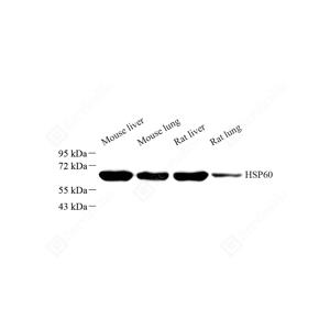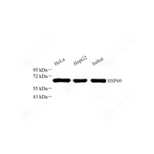 WB检测Hsp60蛋白(货号 GB112464). 样品: 经RIPA裂解液(货号G2002)处理的蛋白质. 封闭: 3%脱脂牛奶(货号GC310001)溶于TBST溶液, 室温孵育1小时. —抗: 1: 250稀释, 4℃ 孵育过夜. 二抗: HRP标记山羊抗兔IgG (H+L) (货号GB23303), 1: 5000稀释, 室温孵育1小时. |