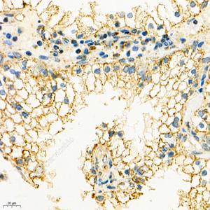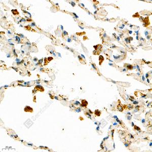 IHC检测Hsp60蛋白(货号 GB112464). 样品: 人肺, 4%多聚甲醛 (货号G1101) 固定12-24小时. 抗原修复: 柠檬酸抗原修复液(干粉, pH 6.0) (G1201), 98℃, 20分钟. —抗: 1: 1000稀释, 4℃ 孵育过夜. 二抗: HRP标记山羊抗兔IgG (H+L) (货号GB23303), 1: 200稀释, 室温孵育1小时. |