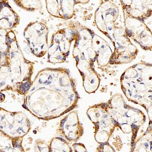 IHC检测Hsp60蛋白(货号 GB112464). 样品: 人胎盘, 4%多聚甲醛 (货号G1101) 固定12-24小时. 抗原修复: 柠檬酸抗原修复液(干粉, pH 6.0) (G1201), 98℃, 20分钟. —抗: 1: 350稀释, 4℃ 孵育过夜. 二抗: HRP标记山羊抗兔IgG (H+L) (货号GB23303), 1: 200稀释, 室温孵育1小时. |