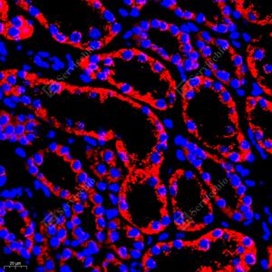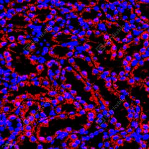 IF检测Hsp60蛋白(货号 GB112464)(红色). 样品: 人肾, 4%多聚甲醛 (货号G1101) 固定12-24小时. 抗原修复: Tris-EDTA抗原修复液(pH 9.0) (G1203), 98℃, 20分钟. 封闭: 3% BSA(货号GC305010)的PBS溶液, 室温孵育30分钟. —抗: 1: 400稀释, 4℃ 孵育过夜. 二抗: Cy3标记山羊抗兔IgG (H+L) (货号GB21303), 1: 300稀释, 室温孵育1小时. |
