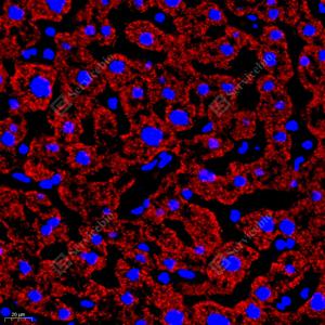 IF检测Hsp60蛋白(货号 GB112464)(红色). 样品: 人肝, 4%多聚甲醛 (货号G1101) 固定12-24小时. 抗原修复: Tris-EDTA抗原修复液(pH 9.0) (G1203), 98℃, 20分钟. 封闭: 3% BSA(货号GC305010)的PBS溶液, 室温孵育30分钟. —抗: 1: 400稀释, 4℃ 孵育过夜. 二抗: Cy3标记山羊抗兔IgG (H+L) (货号GB21303), 1: 300稀释, 室温孵育1小时. |