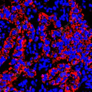 IF检测Hsp60蛋白(货号 GB112464)(红色). 样品: 人肺癌, 4%多聚甲醛 (货号G1101) 固定12-24小时. 抗原修复: Tris-EDTA抗原修复液(pH 9.0) (G1203), 98℃, 20分钟. 封闭: 3% BSA(货号GC305010)的PBS溶液, 室温孵育30分钟. —抗: 1: 400稀释, 4℃ 孵育过夜. 二抗: Cy3标记山羊抗兔IgG (H+L) (货号GB21303), 1: 300稀释, 室温孵育1小时. |
