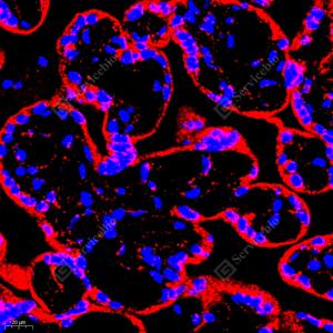 IF检测Hsp60蛋白(货号 GB112464)(红色). 样品: 人胎盘, 4%多聚甲醛 (货号G1101) 固定12-24小时. 抗原修复: Tris-EDTA抗原修复液(pH 9.0) (G1203), 98℃, 20分钟. 封闭: 3% BSA(货号GC305010)的PBS溶液, 室温孵育30分钟. —抗: 1: 400稀释, 4℃ 孵育过夜. 二抗: Cy3标记山羊抗兔IgG (H+L) (货号GB21303), 1: 300稀释, 室温孵育1小时. |