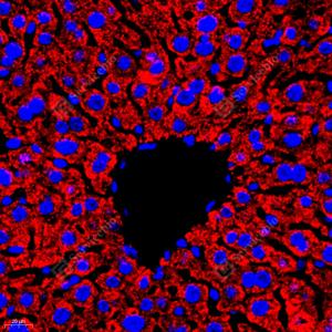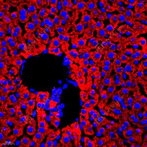 IF检测Hsp60蛋白(货号 GB112464)(红色). 样品: 小鼠肝, 4%多聚甲醛 (货号G1101) 固定12-24小时. 抗原修复: Tris-EDTA抗原修复液(pH 9.0) (G1203), 98℃, 20分钟. 封闭: 3% BSA(货号GC305010)的PBS溶液, 室温孵育30分钟. —抗: 1: 400稀释, 4℃ 孵育过夜. 二抗: Cy3标记山羊抗兔IgG (H+L) (货号GB21303), 1: 300稀释, 室温孵育1小时. |
