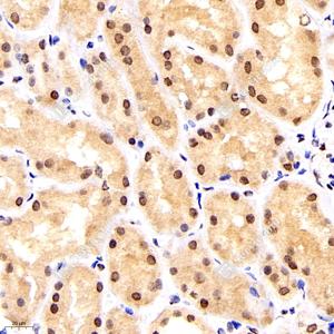 | IHC检测HDAC1蛋白(货号 GB11333). 样品: 人肾, 4%多聚甲醛 (货号G1101) 固定12-24小时. 抗原修复: 柠檬酸抗原修复液(干粉, pH 6.0) (G1201), 98℃, 20分钟. —抗: 1: 300稀释, 4℃ 孵育过夜. 二抗: HRP标记山羊抗兔IgG (H+L) (货号GB23303), 1: 200稀释, 室温孵育1小时. |