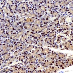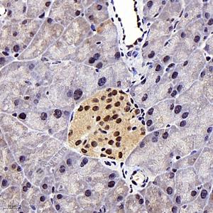 | IHC检测HDAC1蛋白(货号 GB11333). 样品: 大鼠胰腺, 4%多聚甲醛 (货号G1101) 固定12-24小时. 抗原修复: 柠檬酸抗原修复液(干粉, pH 6.0) (G1201), 98℃, 20分钟. —抗: 1: 300稀释, 4℃ 孵育过夜. 二抗: HRP标记山羊抗兔IgG (H+L) (货号GB23303), 1: 200稀释, 室温孵育1小时. |