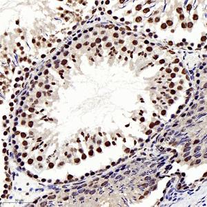 | IHC检测HDAC1蛋白(货号 GB11333). 样品: 大鼠睾丸, 4%多聚甲醛 (货号G1101) 固定12-24小时. 抗原修复: 柠檬酸抗原修复液(干粉, pH 6.0) (G1201), 98℃, 20分钟. —抗: 1: 400稀释, 4℃ 孵育过夜. 二抗: HRP标记山羊抗兔IgG (H+L) (货号GB23303), 1: 200稀释, 室温孵育1小时. |