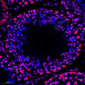 | IF检测HDAC1蛋白(货号 GB11333)(红色). 样品: 大鼠睾丸, 4%多聚甲醛 (货号G1101) 固定12-24小时. 抗原修复: Tris-EDTA抗原修复液(pH 9.0) (G1203), 98℃, 20分钟. 封闭: 3% BSA(货号GC305010)的PBS溶液, 室温孵育30分钟. —抗: 1: 200稀释, 4℃ 孵育过夜. 二抗: Cy3标记山羊抗兔IgG (H+L) (货号GB21303), 1: 300稀释, 室温孵育1小时. |
