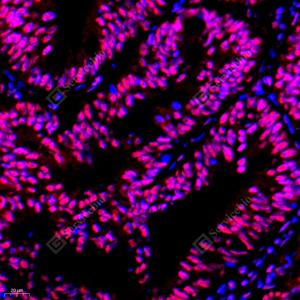 | IF检测HDAC1蛋白(货号 GB12333)(红色). 样品: 大鼠结肠, 4%多聚甲醛 (货号G1101) 固定12-24小时. 抗原修复: 柠檬酸抗原修复液(干粉, pH 6.0) (G1201), 高压锅均匀喷气计时2分钟. 封闭: 3% BSA(货号GC305010)的PBS溶液, 室温孵育30分钟. —抗: 1: 1000稀释, 4℃ 孵育过夜. 二抗: Cy3标记山羊抗小鼠IgG (H+L) (货号GB21301), 1: 300稀释, 室温孵育1小时. |